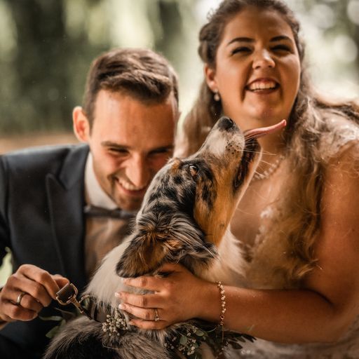 Die Zeremonie selbst war ein Wechselbad der Gefühle. Von tief emotionalen Momenten, in denen Tränen der Rührung flossen, bis hin zu heiteren Augenblicken, in denen vor allem Rafael herzhaft lachte. Diese Mischung aus Emotionen machte die Trauung lebendig und unvergesslich. Besonders berührend war das persönliche Trauritual, in dem das Paar symbolisch ihr Zuhause baute, unterstützt von allen Anwesenden. Ein unerwarteter Höhepunkt war der Moment, als Maybe, auf die Frage, ob sie auch einverstanden sei, dass Herrchen und Frauchen nun heiraten wollten, ein freudiges JA wuffte.