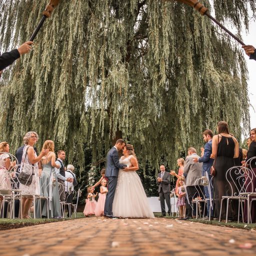 Die Trauung fand unter einer alten Trauerweide an einem idyllischen Teich statt, auf einer spanischen Finca im Süden Deutschlands. Die Kulisse war einfach traumhaft: Natur, die in voller Pracht strahlte, umgeben von der Wärme eines sonnigen Tages. Rebecca und Rafael, beide wie aus einem Hochzeitsmagazin entsprungen, sowie ihr Hund Maybe, der ebenfalls